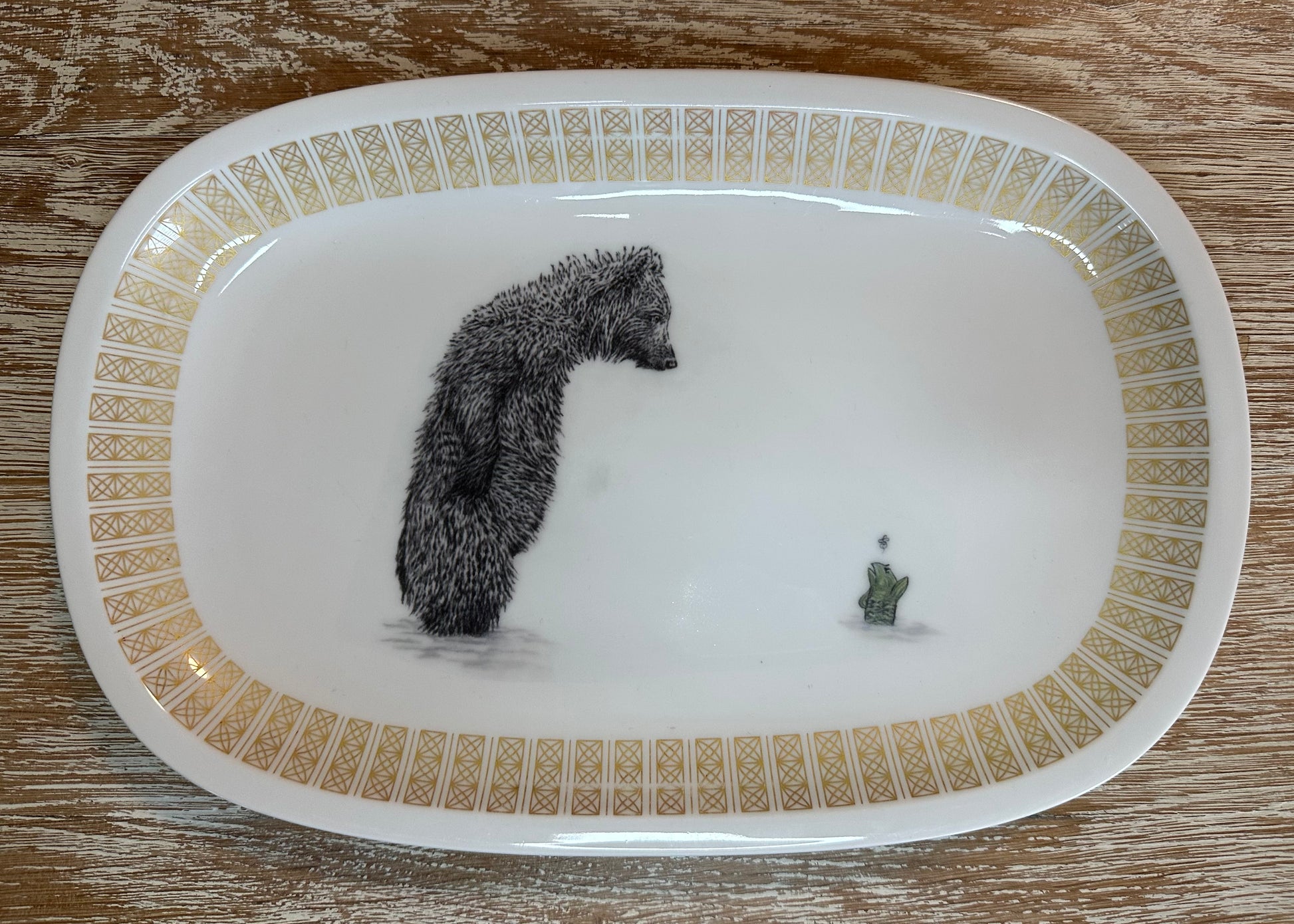 Vintage Platte Bär mit Fisch, 21 x 32 cm, mit Goldrand. Arsberg
