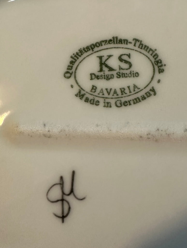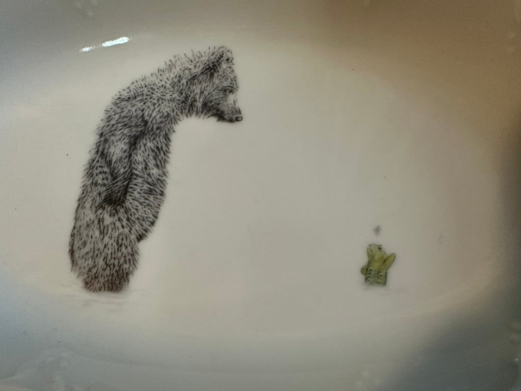 Kleine Vintage Platte mit dem Motiv Bär mit Fisch, 21 cm, mit farblos gemustertem Rand. Bohemia