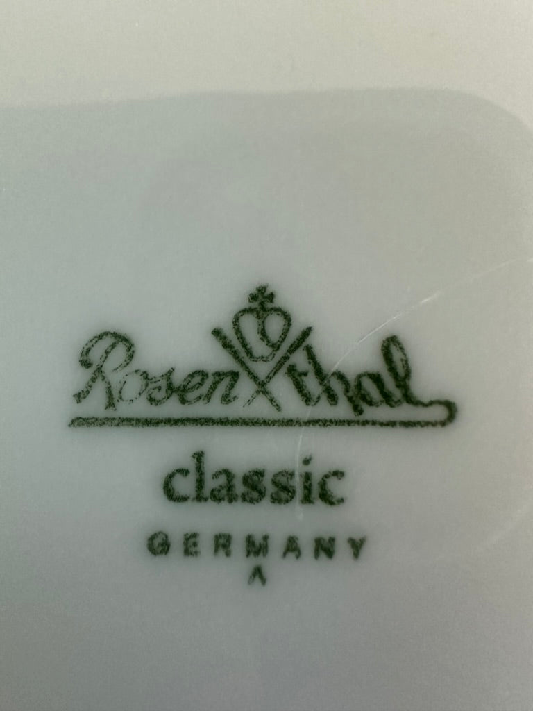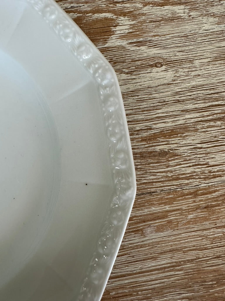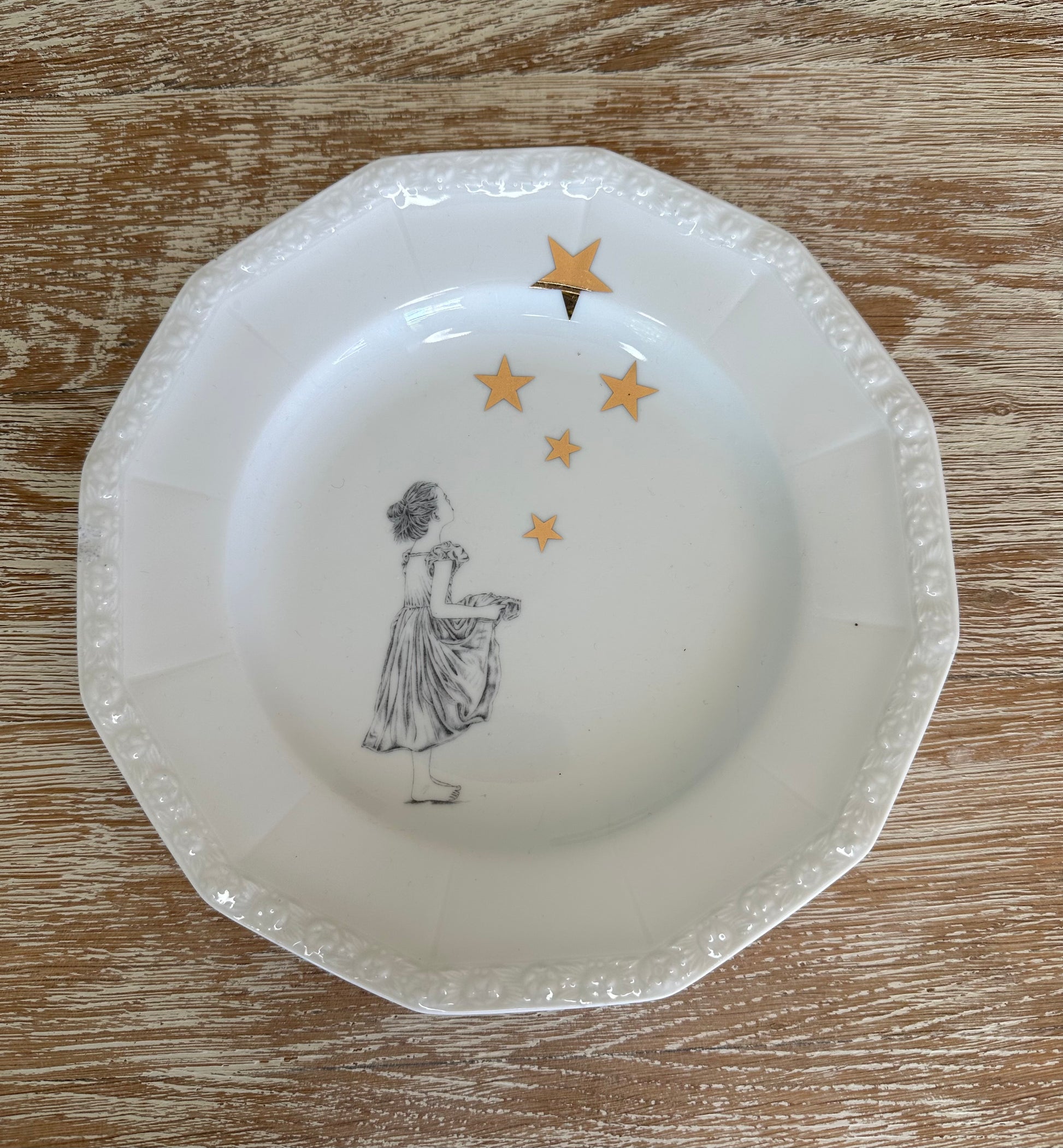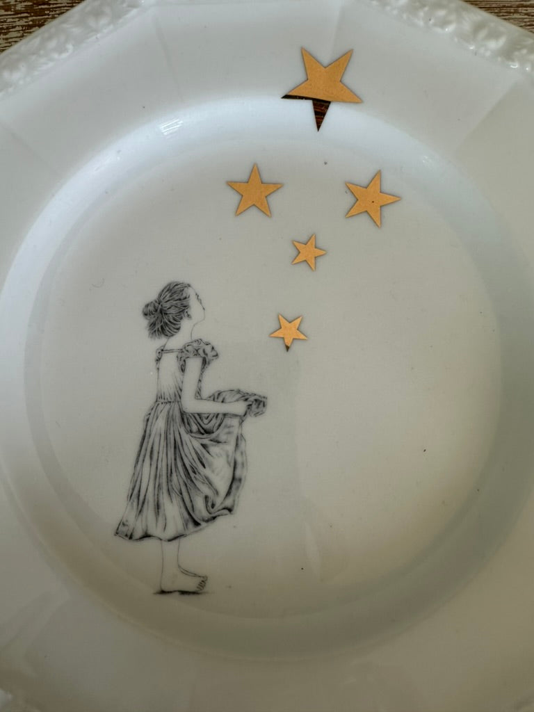 Weisser Vintage Teller mit Sterntaler Motiv und farblos gemustertem Rand.