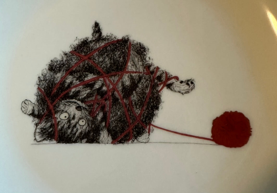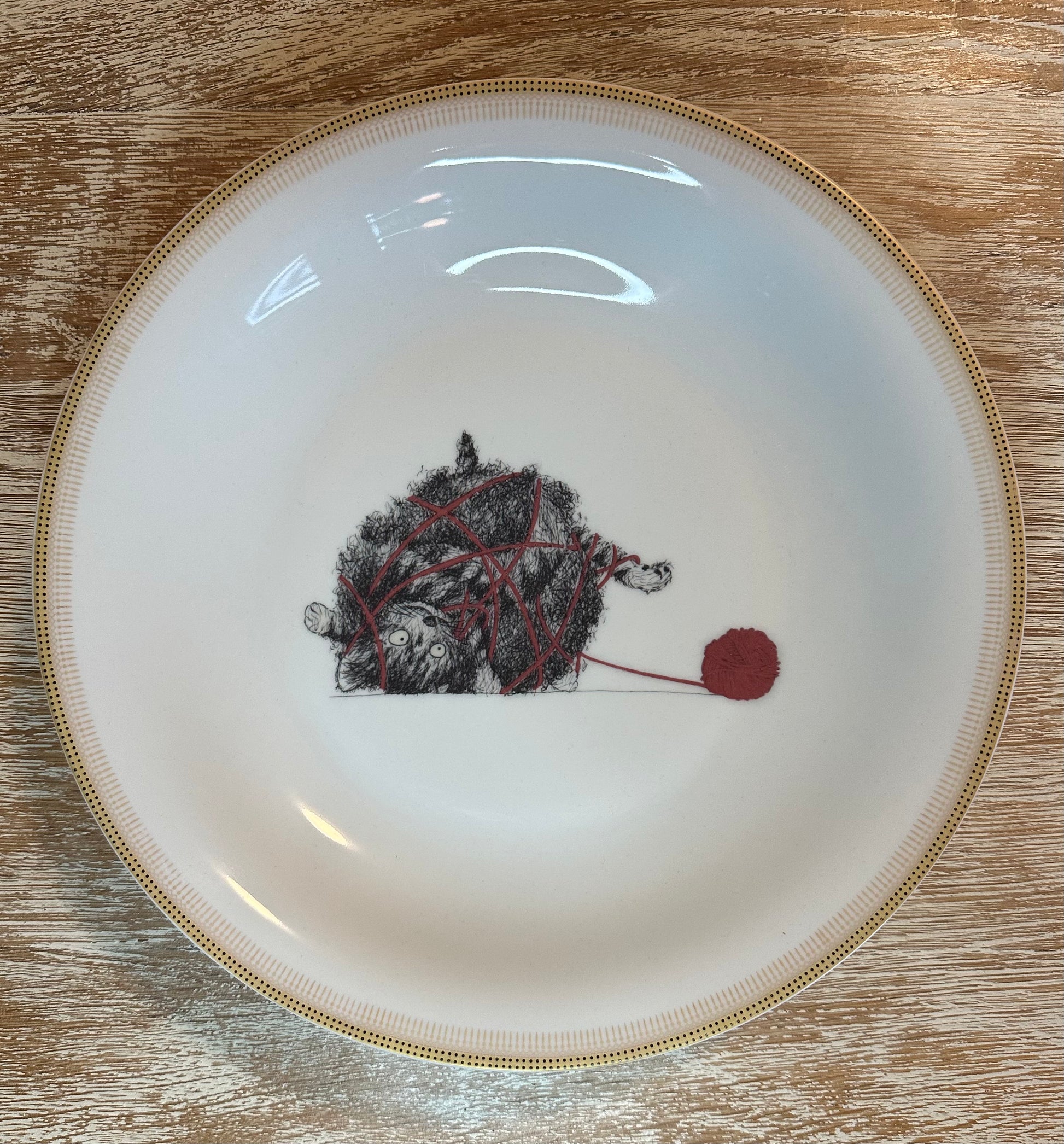 Grosser Vintage Teller, 31 cm, mit Katzenmotiv und Gold gemustertem Rand.